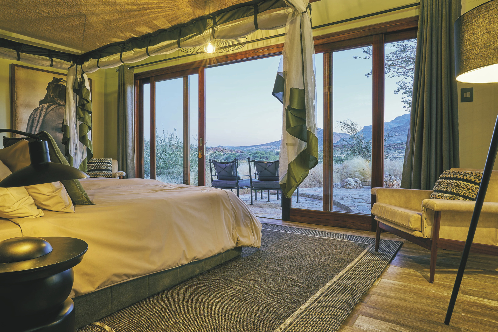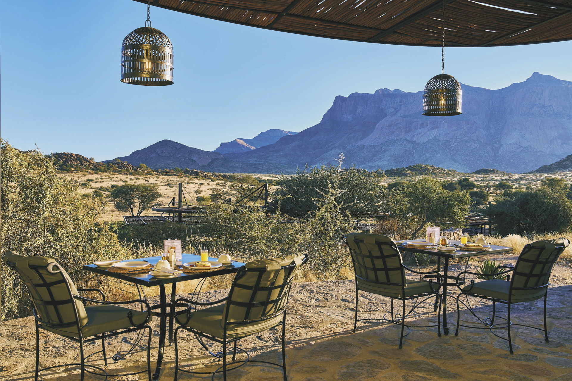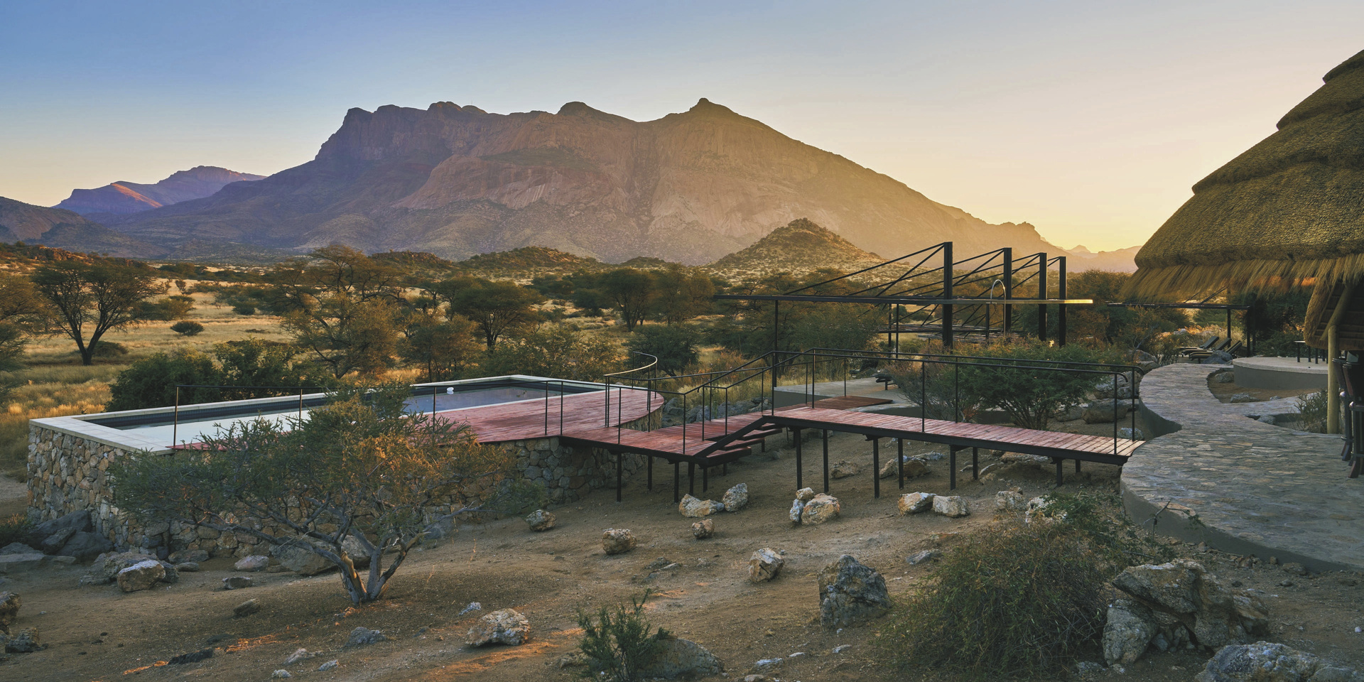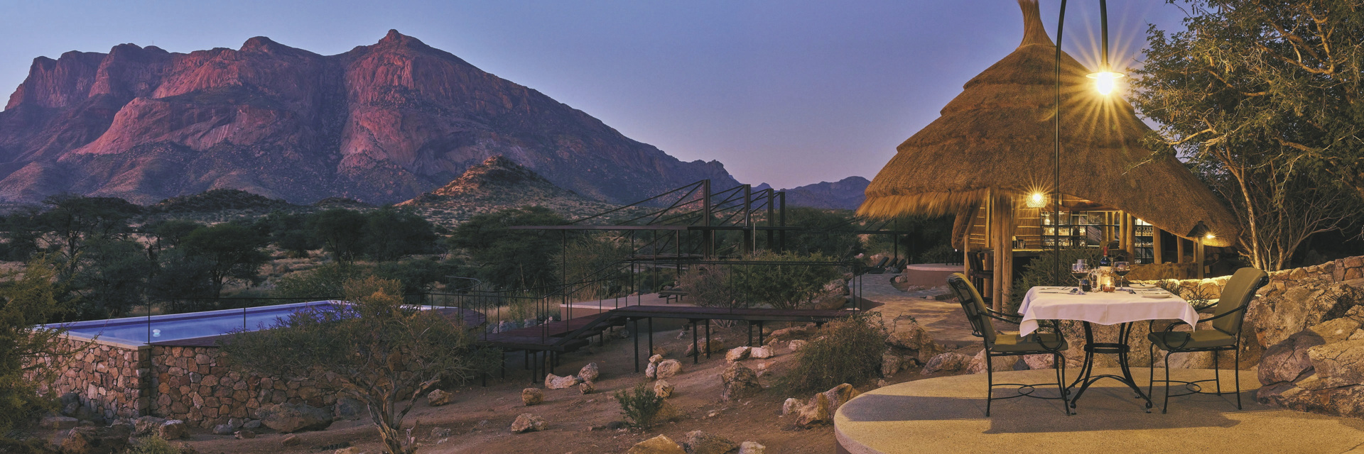 Die Lodge liegt dem höchsten Gipfel des Erongogebirges zu Füßen. Spektakuläre Sonnenuntergänge lassen den Berg in fantastischem roten Licht erscheinen. Im Haupthaus befinden sich das Restaurant und ein kombinierter Lounge-/Barbereich mit Kamin und kostenlosem WLAN. Die Terrasse bietet ein großartiges Panorama und Blick auf das nahe Wasserloch. Auf der Sonnenterrasse am Pool können Sie abschalten und entspannen. Am Abend lässt es sich an der flackernden Feuerstelle gut über die Ereignisse des Tages austauschen. Philipps Cave mit seinen Felsmalereien und die Granitformationen von Bulls Party befinden sich gleich auf der Nachbarfarm. Optionale Aktivitäten: geführte Wanderungen, markierte Wanderwege, Panoramafahrten, Besuch der Felsmalereien, Mountain-Bike Verleih.