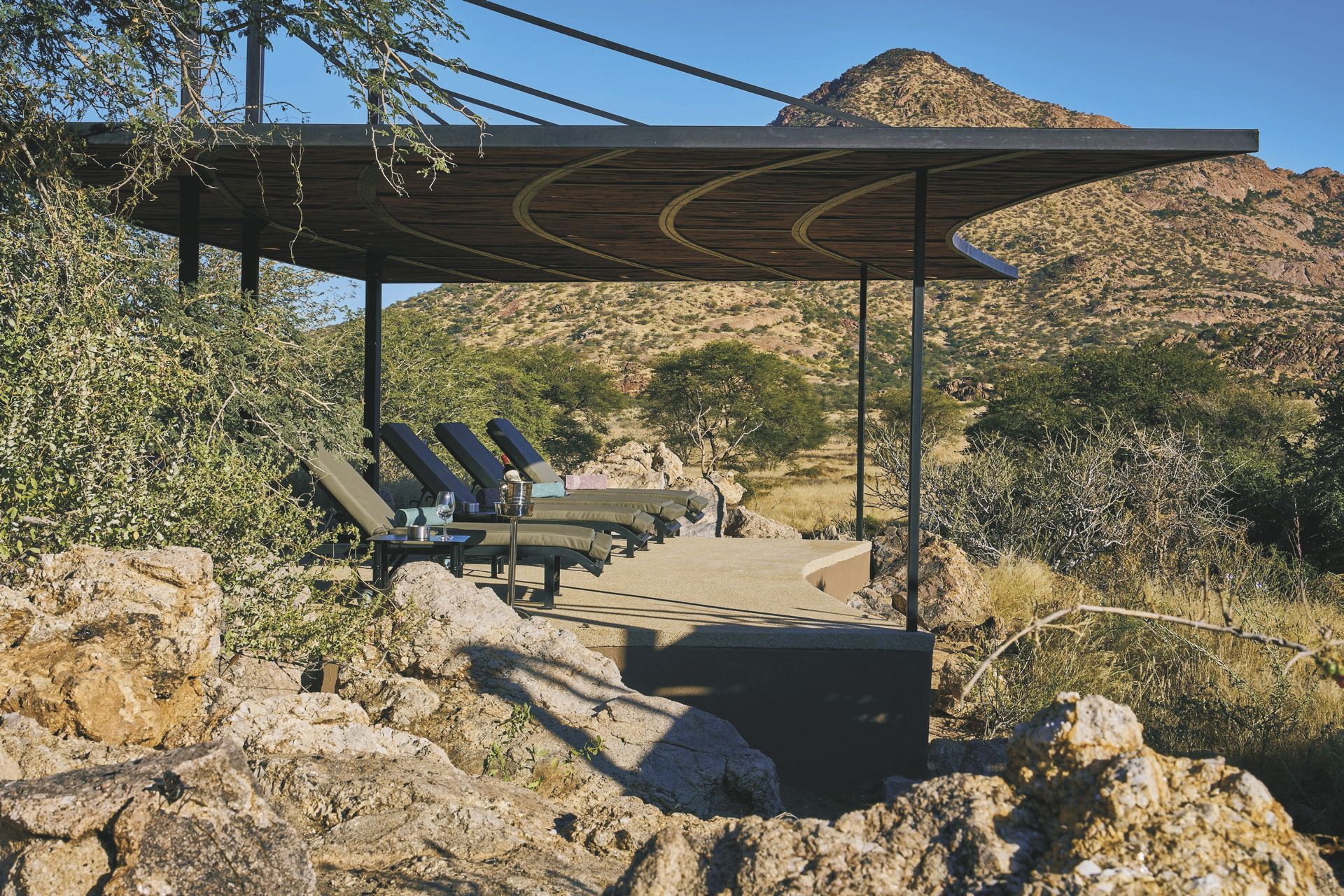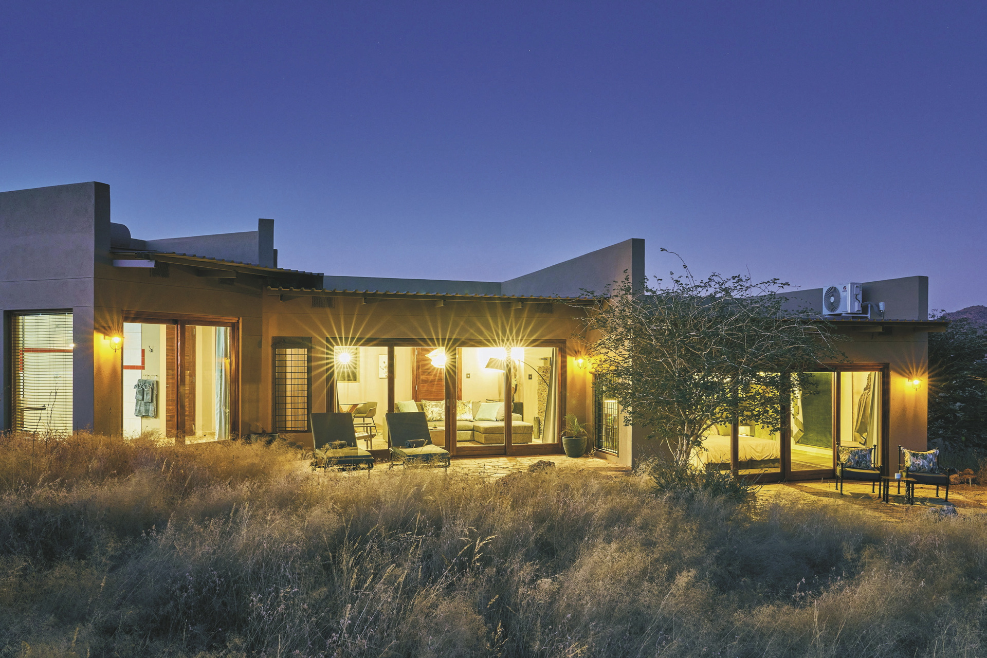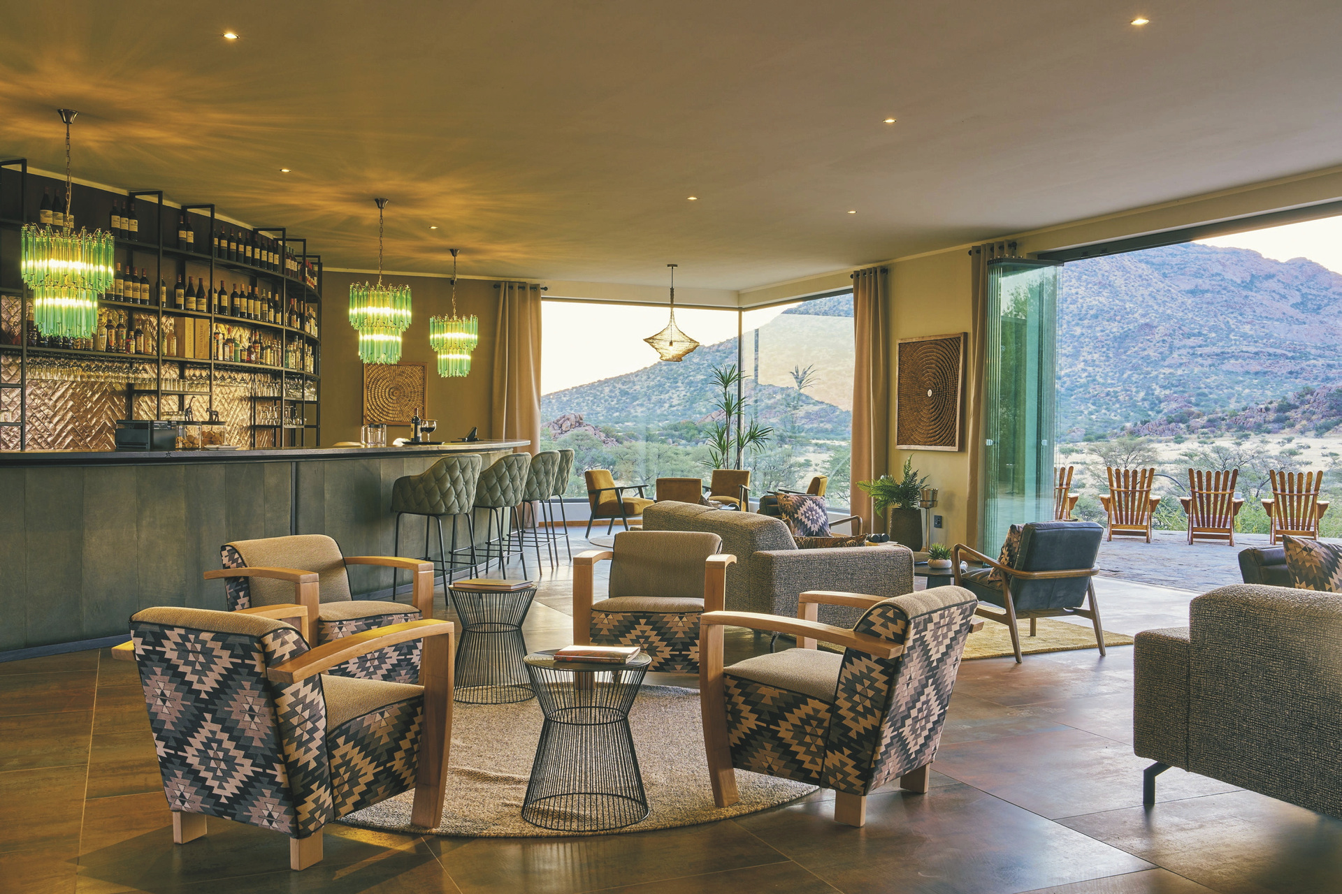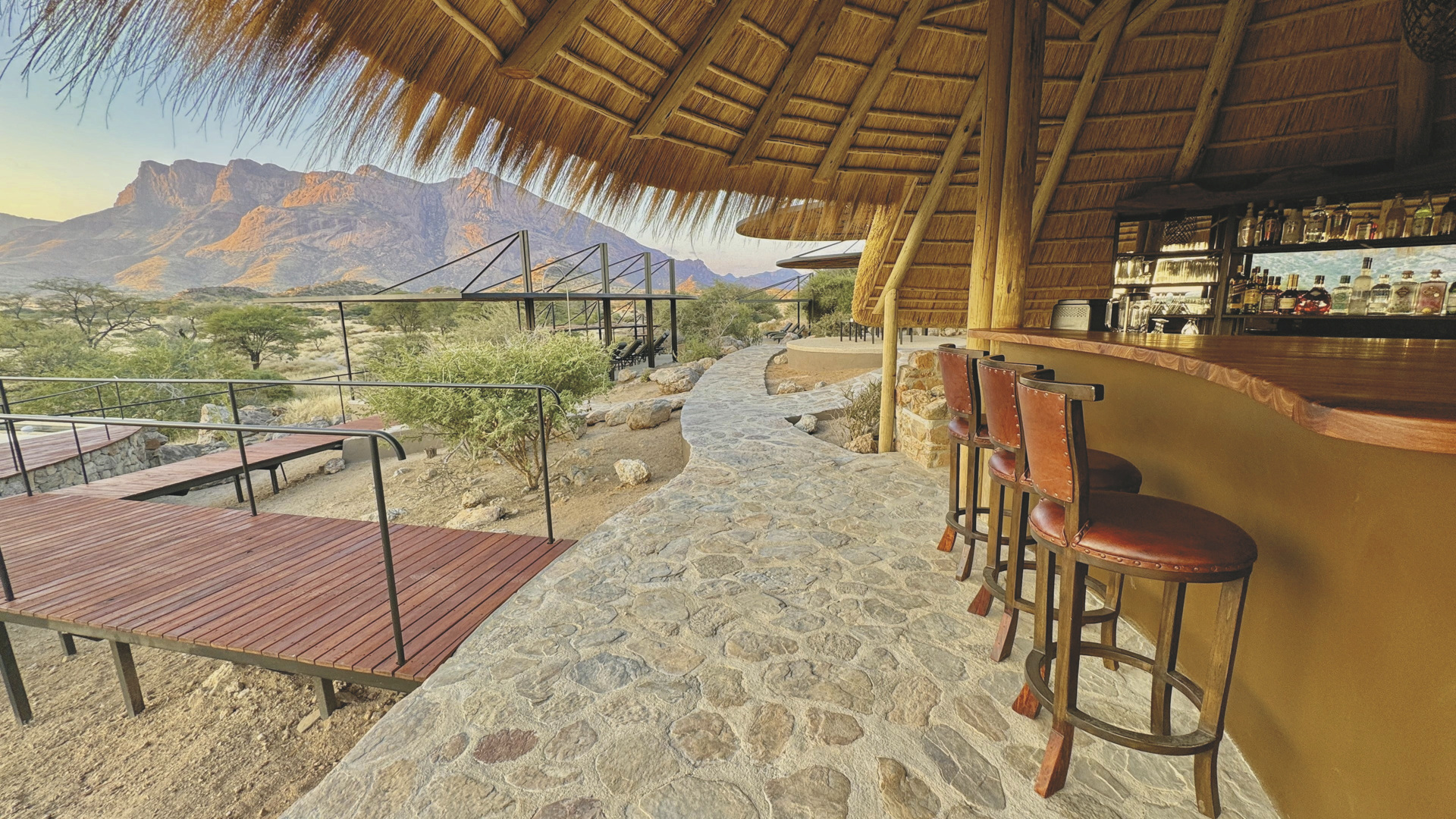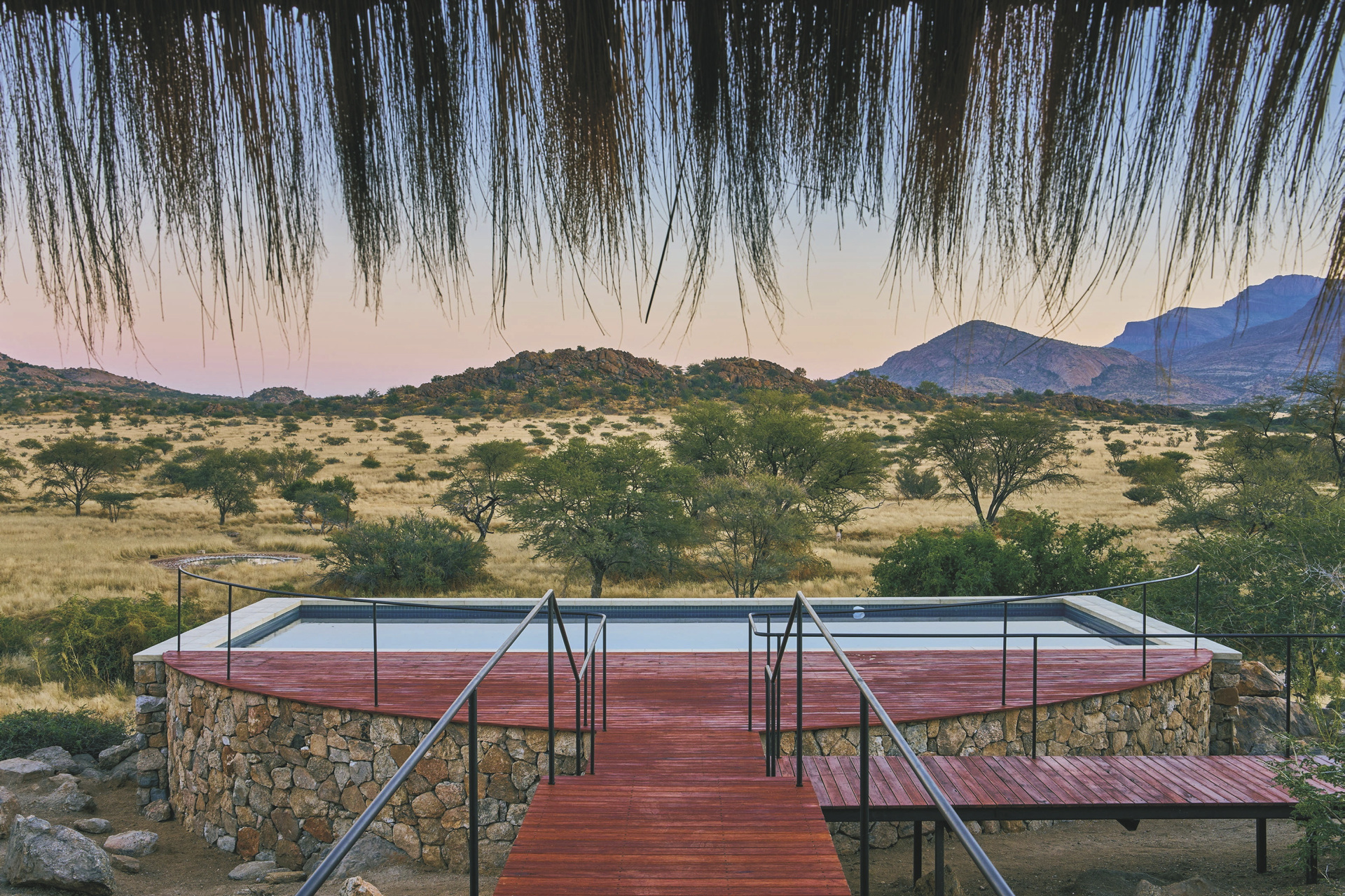 Die Lodge liegt dem höchsten Gipfel des Erongogebirges zu Füßen. Spektakuläre Sonnenuntergänge lassen den Berg in fantastischem roten Licht erscheinen. Im Haupthaus befinden sich das Restaurant und ein kombinierter Lounge-/Barbereich mit Kamin und kostenlosem WLAN. Die Terrasse bietet ein großartiges Panorama und Blick auf das nahe Wasserloch. Auf der Sonnenterrasse am Pool können Sie abschalten und entspannen. Am Abend lässt es sich an der flackernden Feuerstelle gut über die Ereignisse des Tages austauschen. Philipps Cave mit seinen Felsmalereien und die Granitformationen von Bulls Party befinden sich gleich auf der Nachbarfarm. Optionale Aktivitäten: geführte Wanderungen, markierte Wanderwege, Panoramafahrten, Besuch der Felsmalereien, Mountain-Bike Verleih.