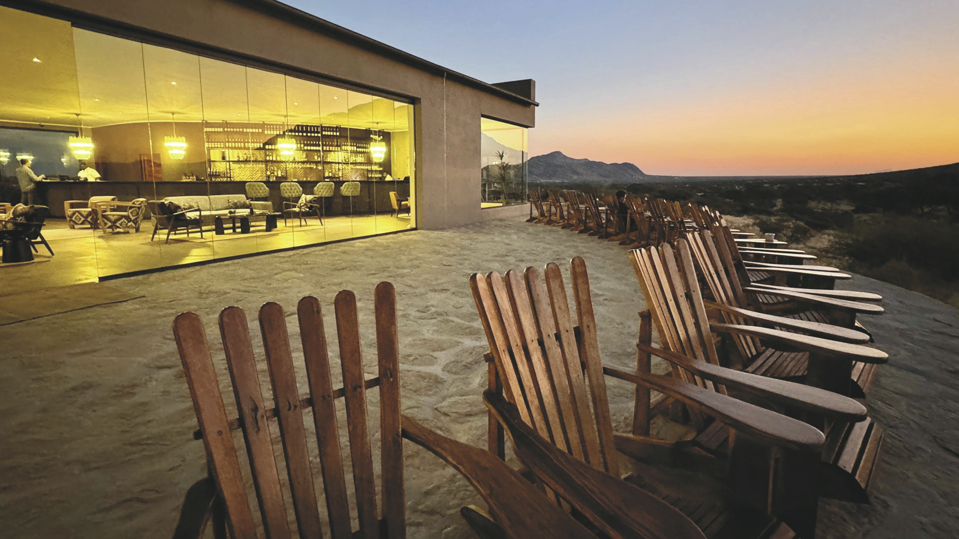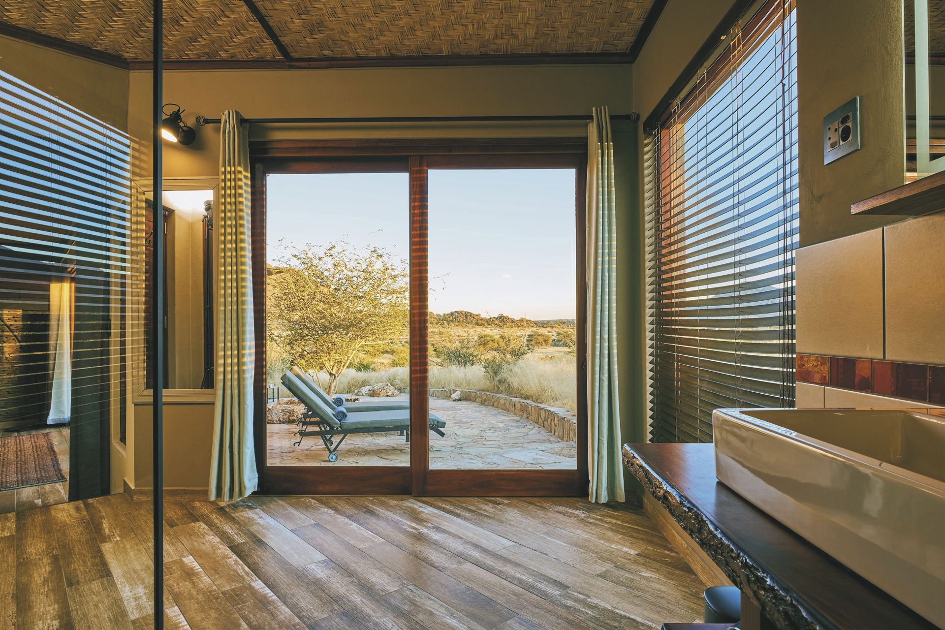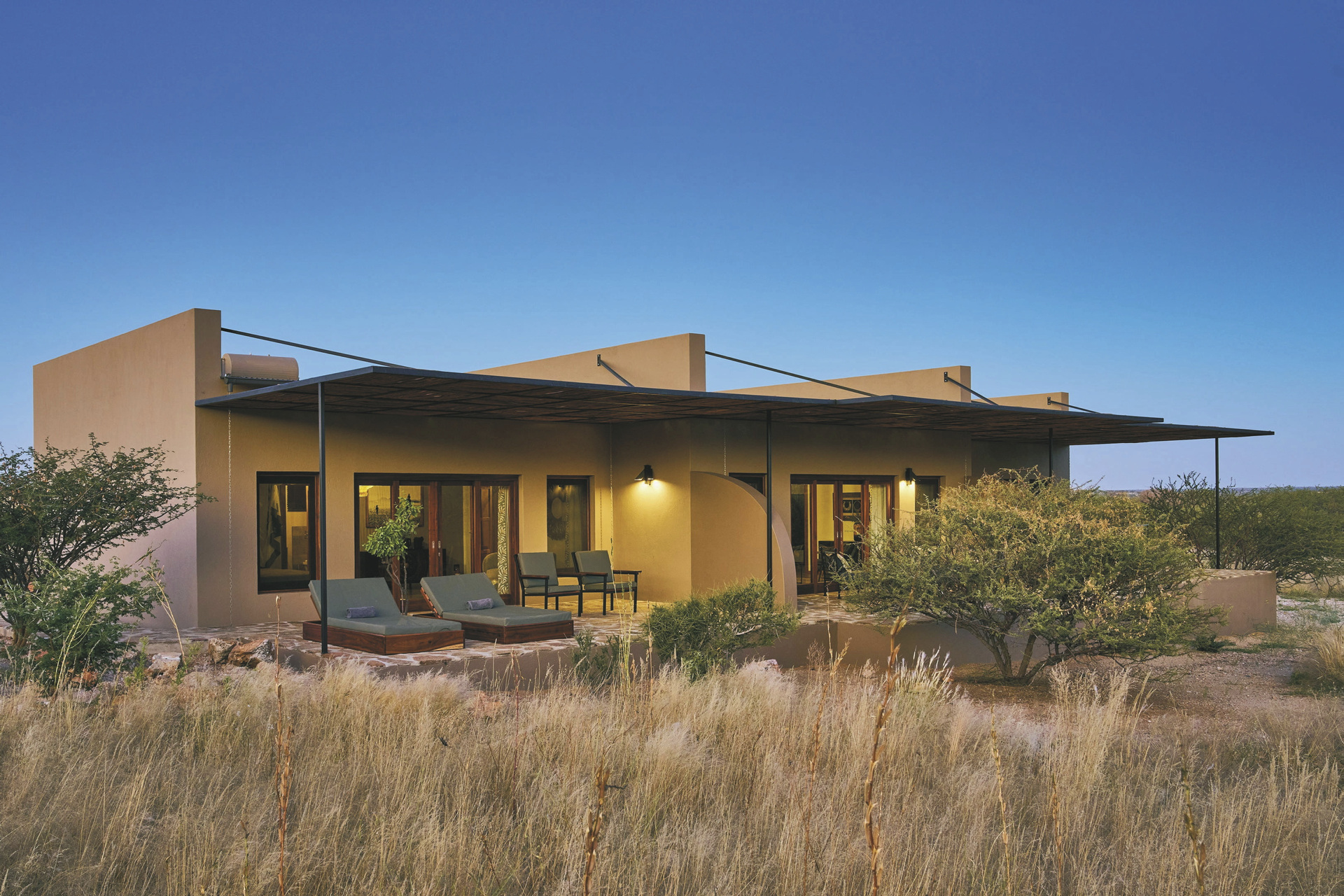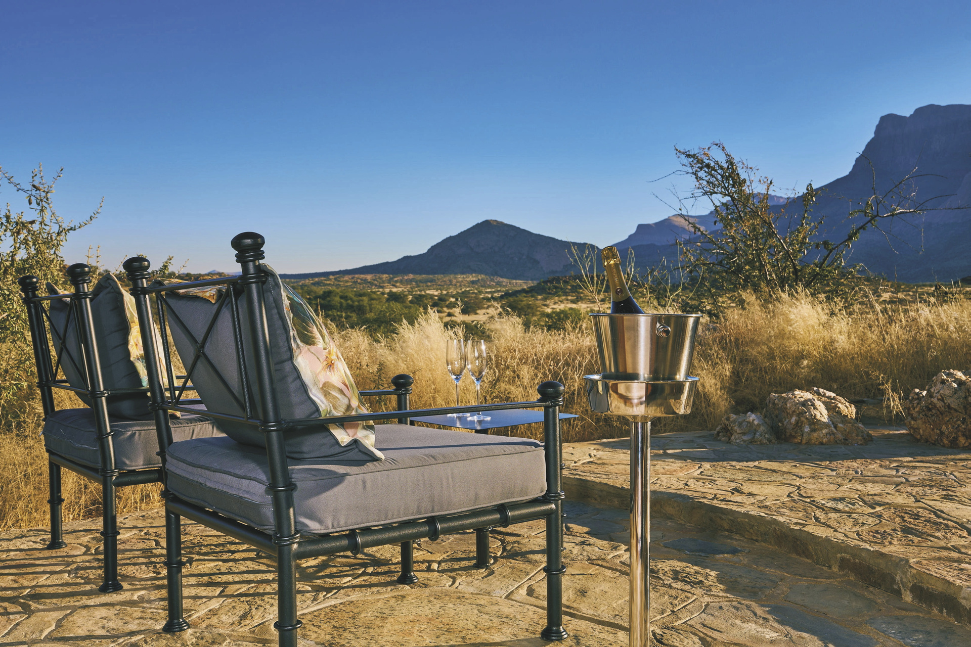 Die Lodge liegt dem höchsten Gipfel des Erongogebirges zu Füßen. Spektakuläre Sonnenuntergänge lassen den Berg in fantastischem roten Licht erscheinen. Im Haupthaus befinden sich das Restaurant und ein kombinierter Lounge-/Barbereich mit Kamin und kostenlosem WLAN. Die Terrasse bietet ein großartiges Panorama und Blick auf das nahe Wasserloch. Auf der Sonnenterrasse am Pool können Sie abschalten und entspannen. Am Abend lässt es sich an der flackernden Feuerstelle gut über die Ereignisse des Tages austauschen. Philipps Cave mit seinen Felsmalereien und die Granitformationen von Bulls Party befinden sich gleich auf der Nachbarfarm. Optionale Aktivitäten: geführte Wanderungen, markierte Wanderwege, Panoramafahrten, Besuch der Felsmalereien, Mountain-Bike Verleih.