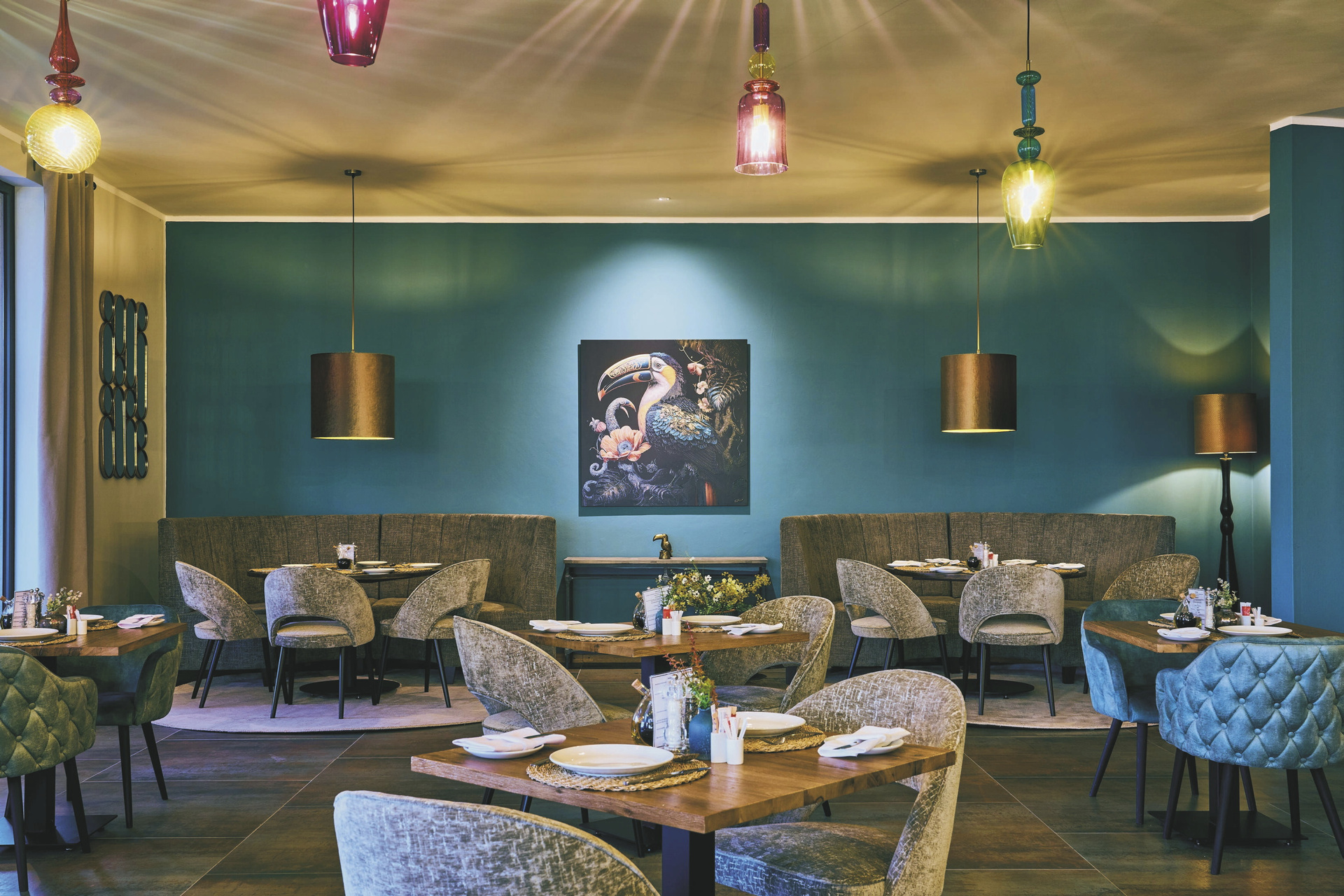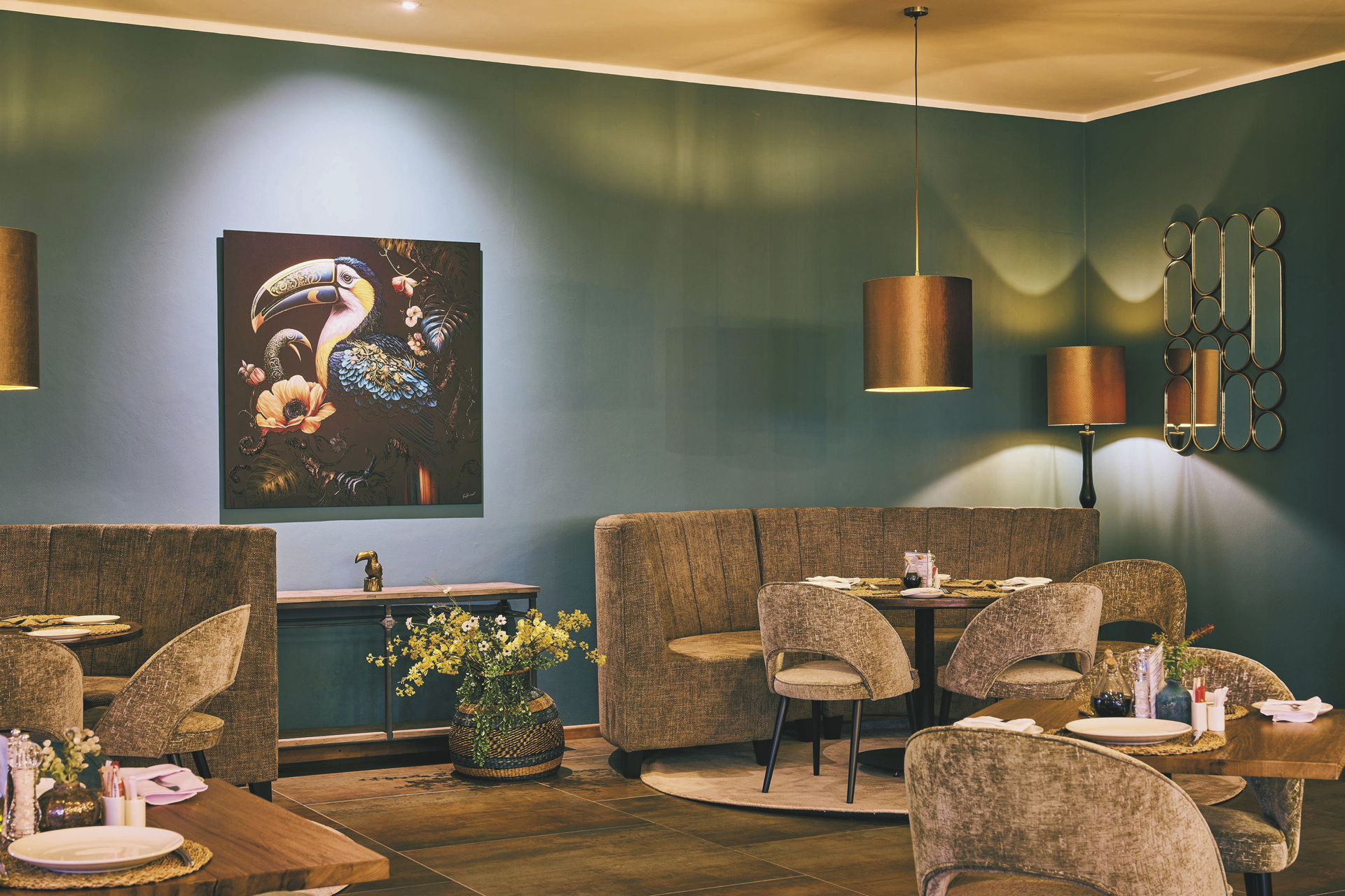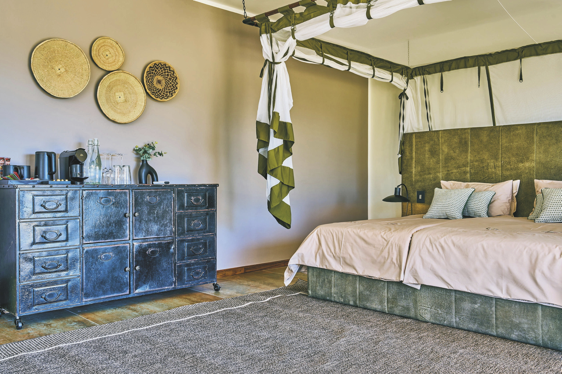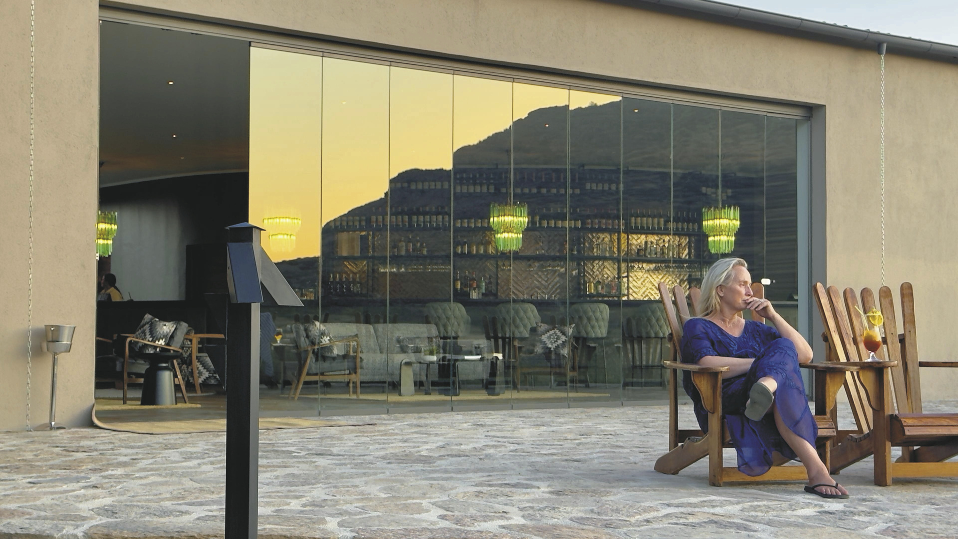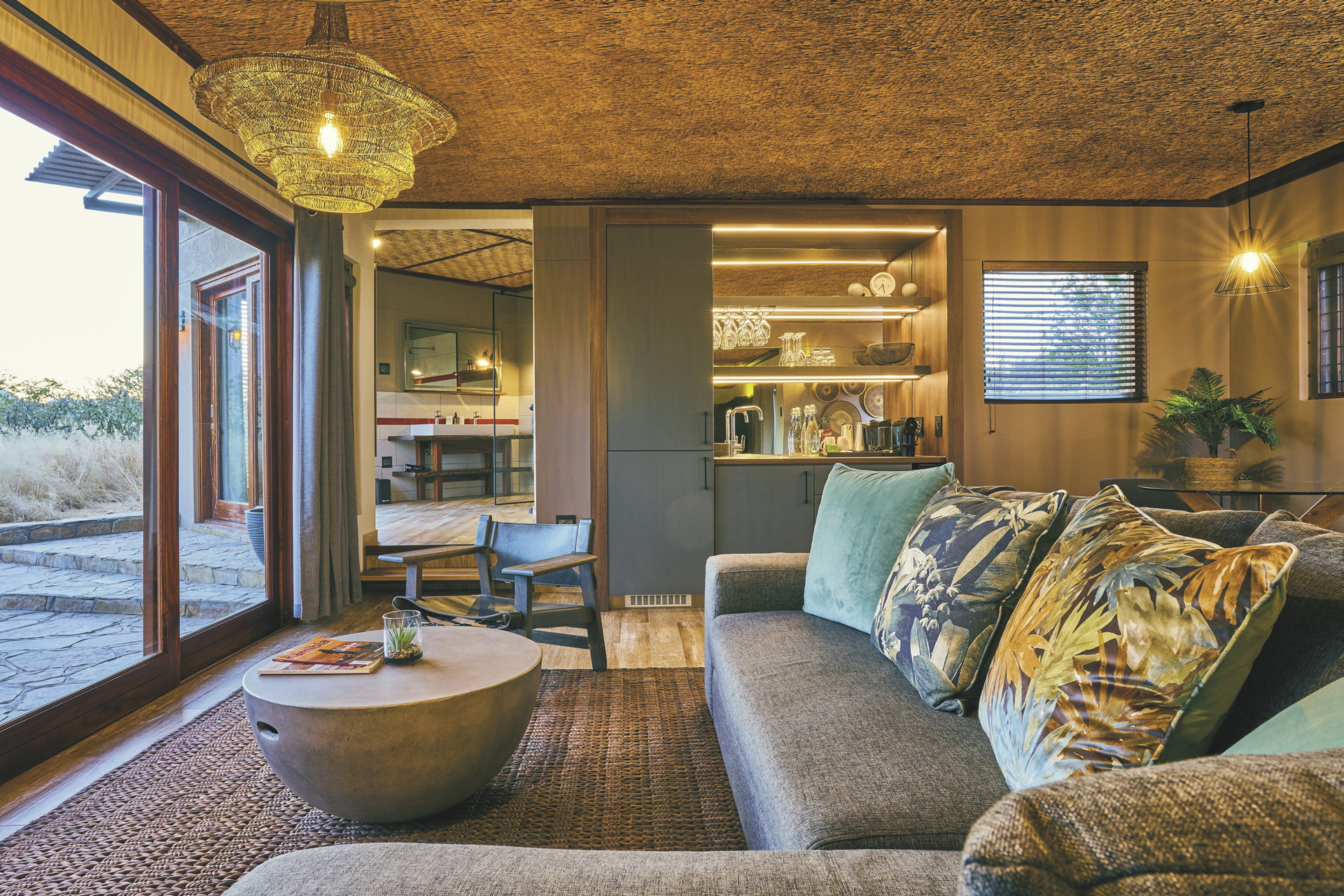 Die Lodge liegt dem höchsten Gipfel des Erongogebirges zu Füßen. Spektakuläre Sonnenuntergänge lassen den Berg in fantastischem roten Licht erscheinen. Im Haupthaus befinden sich das Restaurant und ein kombinierter Lounge-/Barbereich mit Kamin und kostenlosem WLAN. Die Terrasse bietet ein großartiges Panorama und Blick auf das nahe Wasserloch. Auf der Sonnenterrasse am Pool können Sie abschalten und entspannen. Am Abend lässt es sich an der flackernden Feuerstelle gut über die Ereignisse des Tages austauschen. Philipps Cave mit seinen Felsmalereien und die Granitformationen von Bulls Party befinden sich gleich auf der Nachbarfarm. Optionale Aktivitäten: geführte Wanderungen, markierte Wanderwege, Panoramafahrten, Besuch der Felsmalereien, Mountain-Bike Verleih.