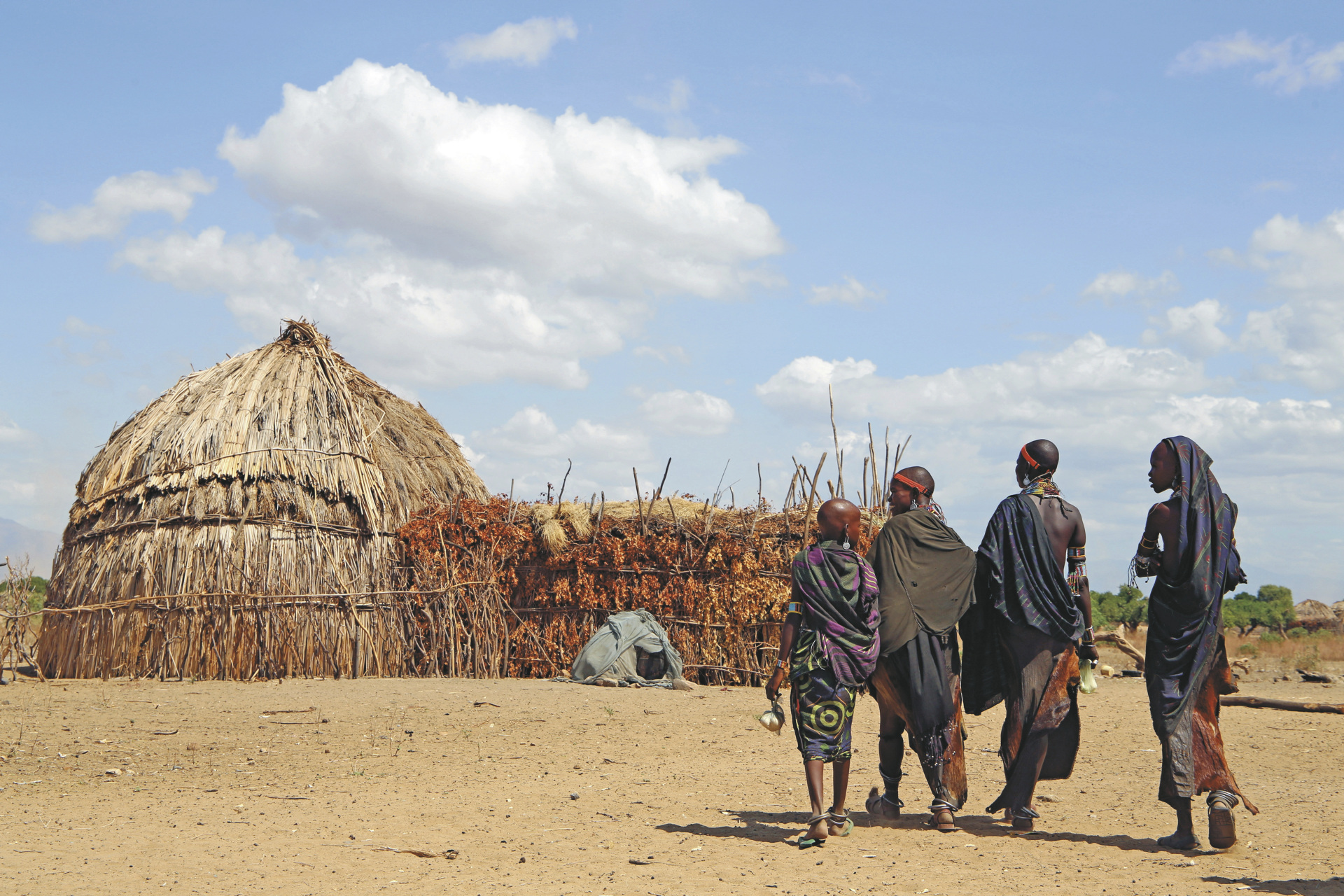 Entlang von Trockenflussläufen, Termitenhügeln und Dornbuschsavannen fahren Sie in das abgelegene Gebiet der Karo, welche in drei Hauptsiedlungen direkt am Omo leben. Das Leben der Karo basiert auf Viehzucht, Imkerei, Schwemmlandfeldbau und Fischfang. Bei einem Rundgang durch ein Dorf gewinnen Sie Einblicke in den lokalen Alltag. Die Karo sind für ihre kreative Körperkunst bekannt. Während die Männer den Leib mit Mustern aus Erdfarben bemalen und oft eine dekorierte „Lehmhaube“ als Statussymbol tragen, schmücken sich die Frauen mit Lippennagel, knubbeliger Ockerfrisur und Perlenketten.