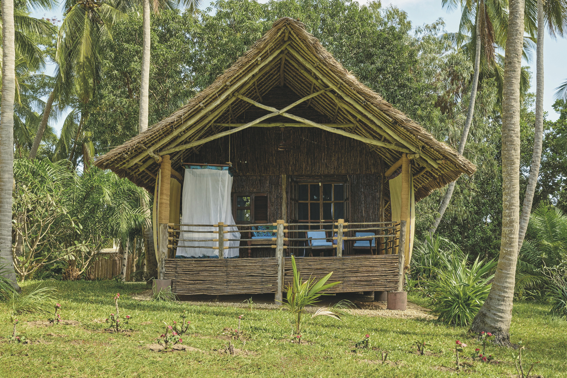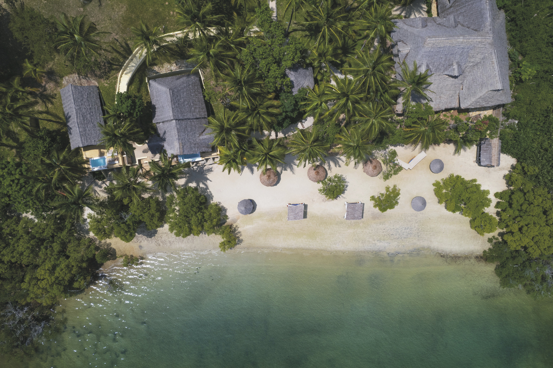 Inmitten von Kokospalmen mit Blick auf die Chloe Bay liegen die 12 geräumigen Bungalows und Suiten. Sie verfügen über ein Bad mit Dusche/WC, Klimaanlage, Deckenventilator und eine Veranda mit Tagesbett. Die Suiten sind größer und haben einen eigenen Plunge Pool. Die Alfajiri und Alasiri Suiten liegen direkt am Strand.