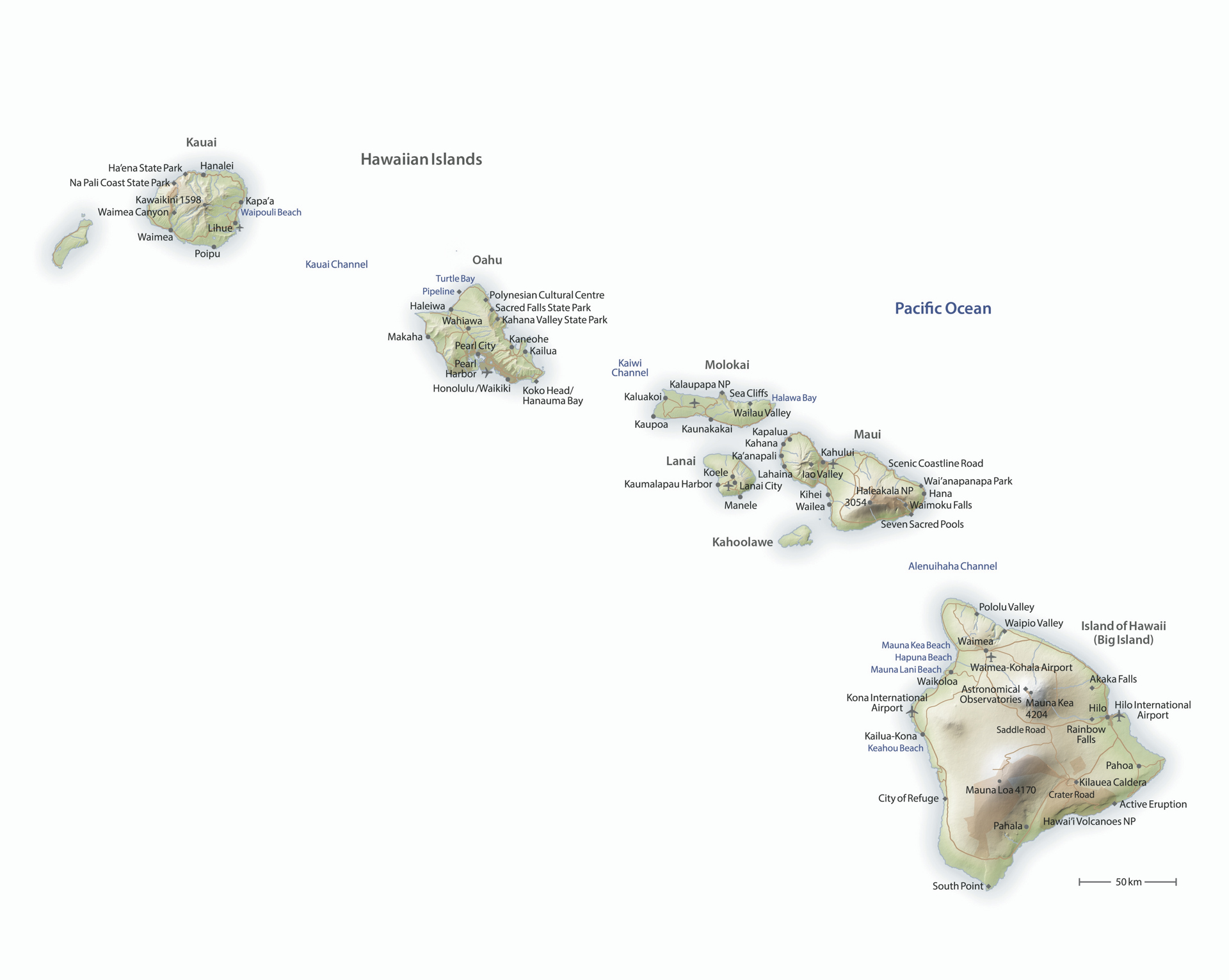 Die Inseln Oahu, Maui, Kauai und Big Island sind wie geschaffen für einen perfekten Urlaub. Die vulkanischen Inseln von Hawaii erheben sich hoch aus dem Ozean, sind üppig bewachsen und von spektakulären Schluchten und Tälern durchschnitten. Es gibt wunderschöne Strände und eine abwechlungsreiche Landschaft mit Wüsten, Grasland, Sümpfen, Wäldern und Bergen.